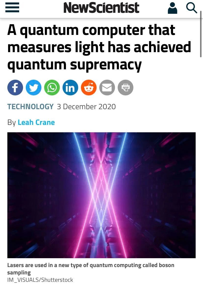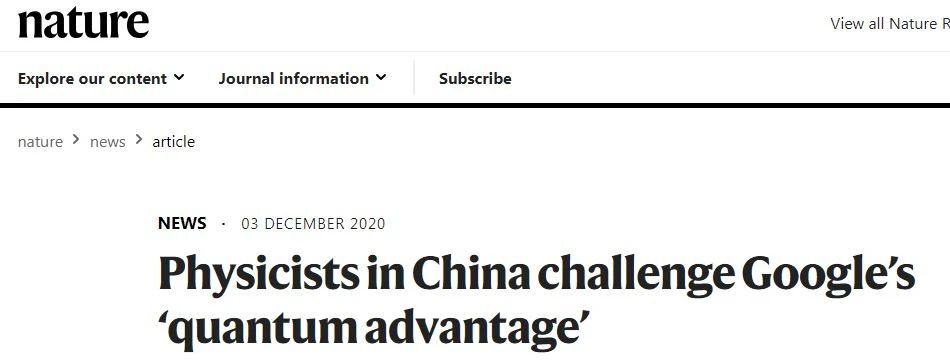 《自然》雜誌發表題為《中國物理學家挑戰谷歌“量子優越性”》的報道説,中國科學家使用激光束進行了一項數學上被證明在普通計算機上幾乎不可能完成的計算。“該團隊在幾分鐘內就完成了現有最好的超級計算機需要地球一半年齡才能完成的任務” ,且與谷歌去年發佈的53個超導比特量子計算原型機的硬件路徑不同。