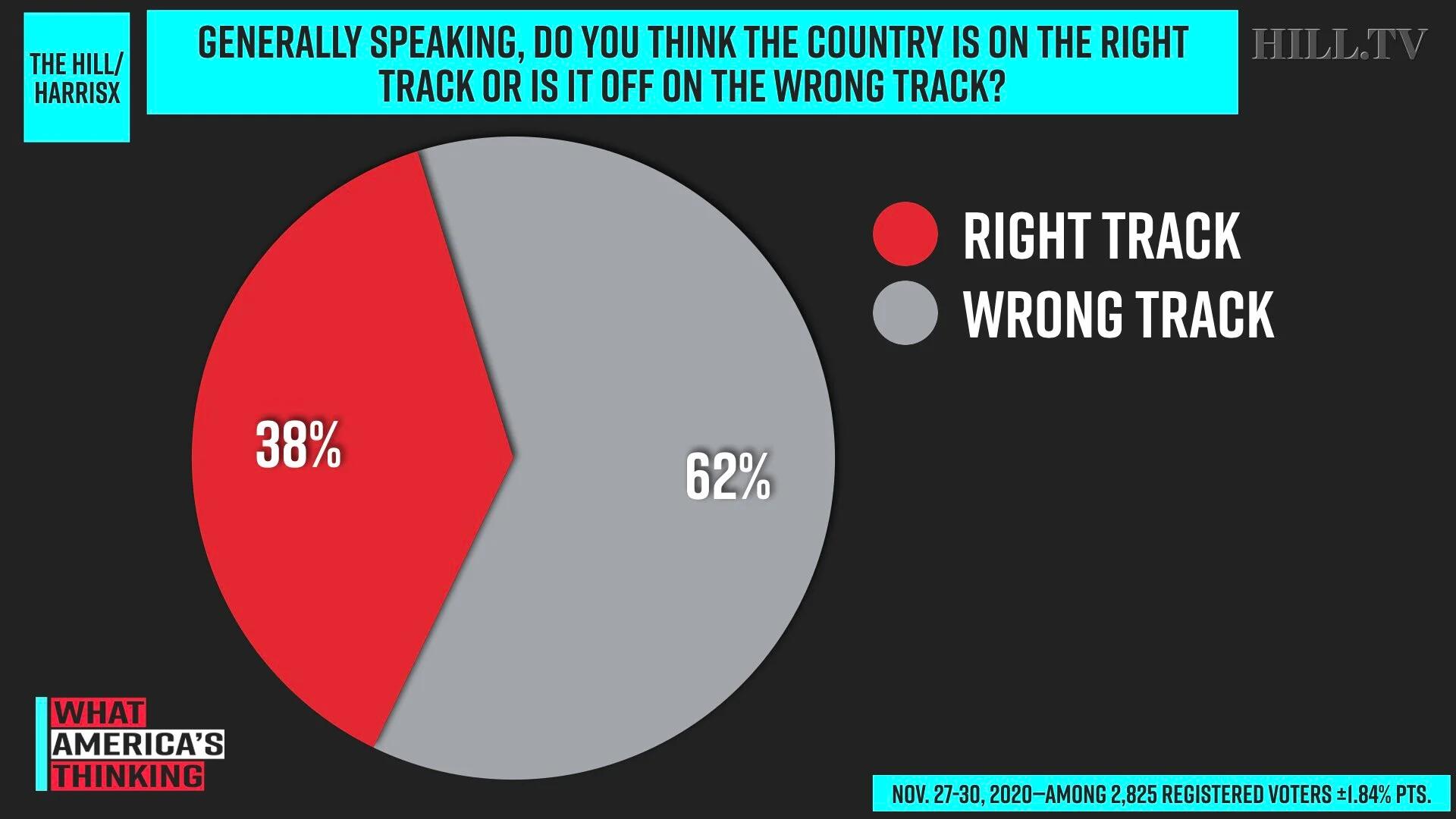 報道介紹稱,這項民意調查於11月27日至30日期間進行,2825名登記選民在網上參與了調查。結果顯示,62%的受訪者認為,美國走上了錯誤的道路。相比之下,38%的受訪者表示,他們認為國家正走在正確的道路上。