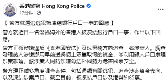 【警方就潛逃逃犯被凍結銀行户口一事的回應】
