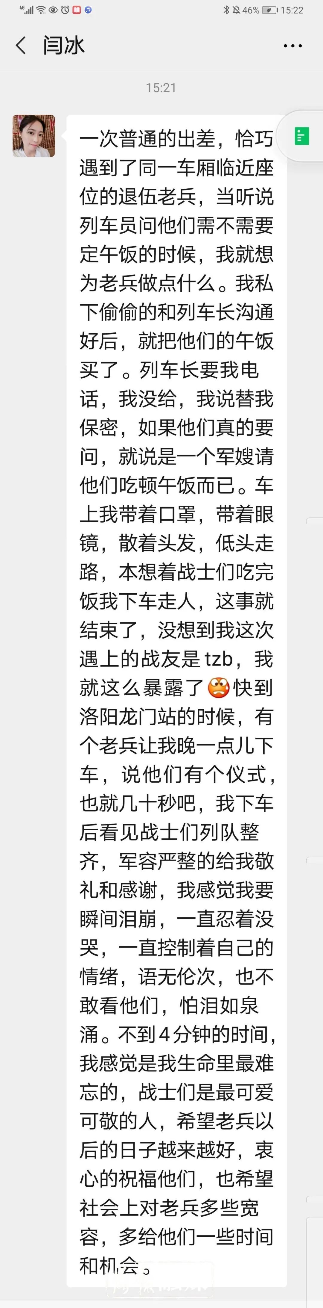 消息發佈不久,從洛陽軍分區以及“兵媽媽”喬文娟那裏同時傳來好消息,在G571列車上為退伍老兵送32份盒飯的軍嫂找到了!