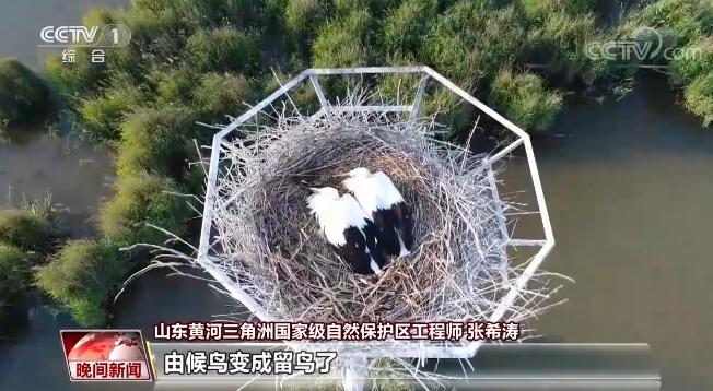 東方白鸛這種鳥原本是候鳥,就在遷徙的時候才路過我們這裏,歇歇腳就飛走了。這些年它們陸續在這裏安家落户,由候鳥變成留鳥了。這説明我們黃河三角洲生態確實好了,鳥兒來到這裏就不想再走了。