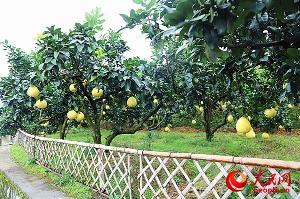 武陵山深處,湖南省鳳凰縣菖蒲塘村的水果產業園裏,沉甸甸的蜜柚掛滿枝頭,一片豐收的景象。