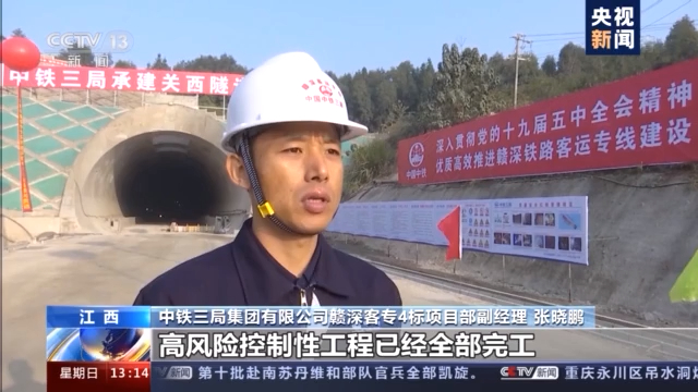 中鐵三局集團有限公司贛深客專4標項目部副經理 張曉鵬: 這座隧道貫通後,贛深高鐵江西段高風險控制性工程已經全部完工。工程施工由隧道、路基、橋樑等線下工程全面轉入無砟軌道、四電、鋪軌等線上工程。