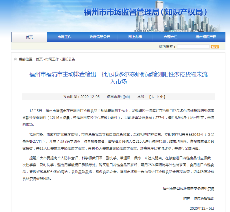 12月5日,福州市福清市在開展進口冷鏈食品主動排查監測工作中,發現轄區一凍庫貯存的進口厄瓜多爾凍蝦新冠肺炎病毒核酸檢測弱陽性(12月6日凌晨,經福州市疾控中心複核為陽性)。目前涉事冷鏈食品(277件,每件9.9公斤)均已封存,未流向市場。