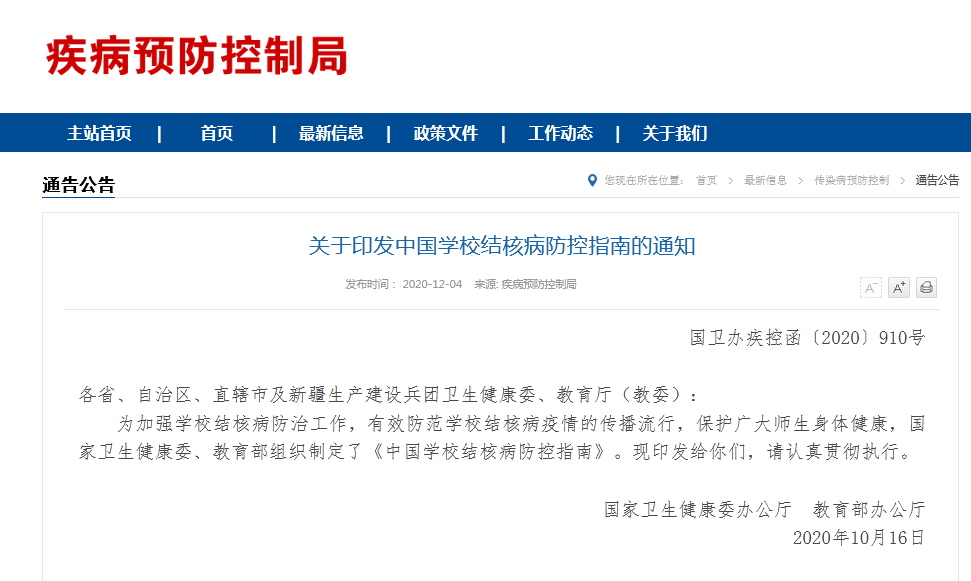 為減少結核病在校園內傳播流行,國家衞健委日前發佈《中國學校結核病防控指南》。其中明確,各級各類學校應在新生入學體檢和教職員工常規體檢中開展結核病相關檢查,並將結果納入學生和教職員工的健康檔案。