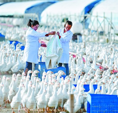 2019年11月,和田地區墨玉縣雅瓦鄉塘開希村養鵝場,兩個姑娘在白鵝的“大和聲”中投放飼料。村民努爾·麥麥提捧着一打蛋走出鵝舍,他在養鵝場每月可掙2000多元,年底還有分紅。