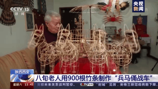 在陝西西安,一位83歲老人歷時四個月、用900多根竹條做了一個能動的“兵馬俑戰車”,戰車的四匹馬和牽繩的士兵都能靈活地動起來。
