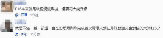 對於台防務部門的説法,不乏有島內網友諷刺:“F16本來就是破銅爛鐵戰機,還要花大錢升級。”還有網友質疑,就是不堪一擊,卻還一直在幻想跟大陸打仗?