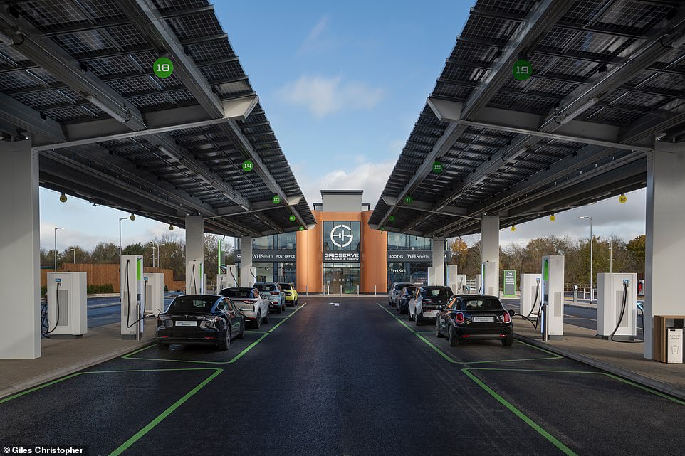 英國首個電動汽車充電站在埃塞克斯郡布倫特裏附近開業,可同時為36輛電動汽車充電(圖源:《每日郵報》)