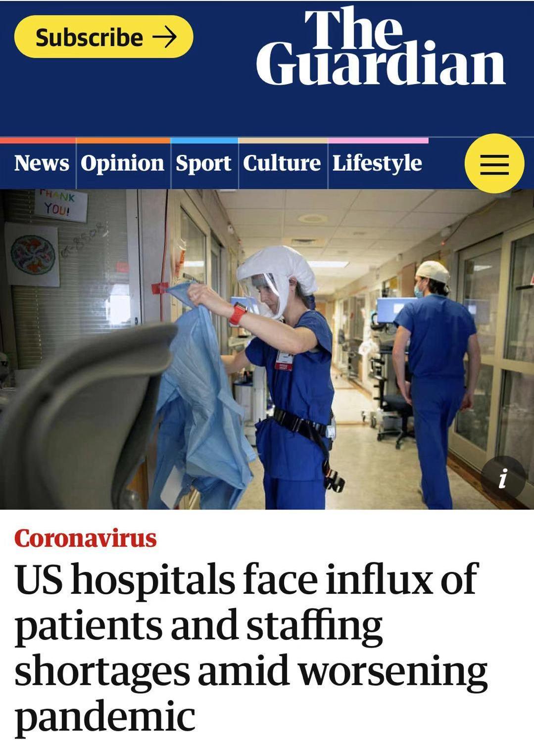 據《衞報》報道,在北達科他州,重症監護室的病牀佔用率達到了91%,護理人員短缺的醫療中心已達35%。該州州長宣佈,北達科他州將實施“危機時刻”方針,允許新冠病毒檢測結果呈陽性的護士留守崗位。