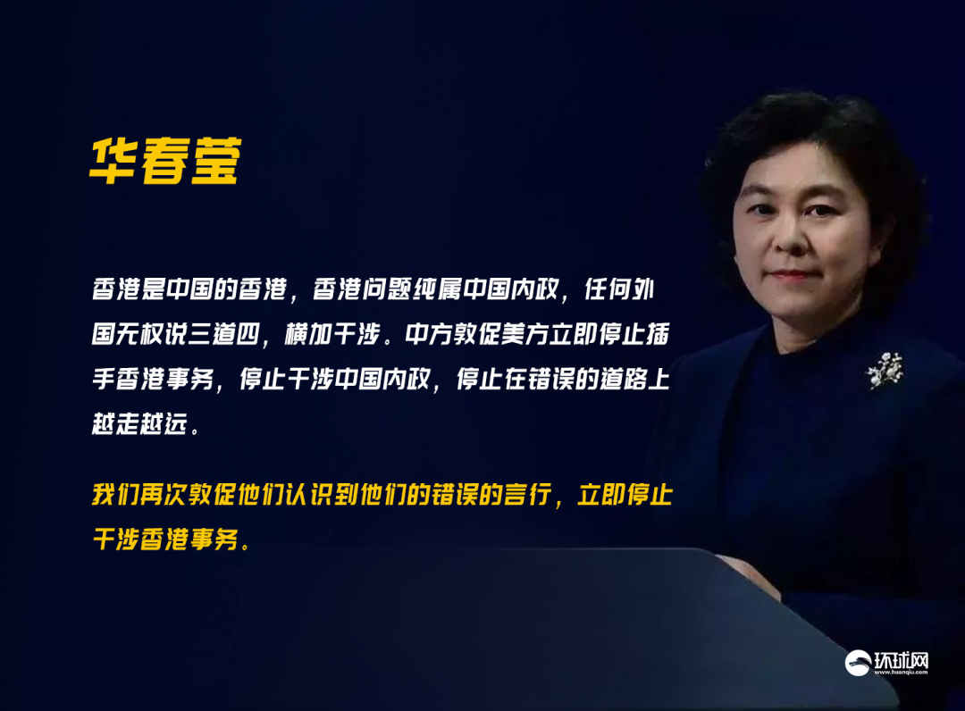 華春瑩強調,之前中方已經多次表明,中國一直堅決反對並強烈譴責美方借香港問題干涉中國內政,對中方人員進行所謂的制裁,我們已經就此多次向美方表明了嚴正的立場,並已經做出了一些正當和必要的回應。
