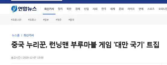 在6日播出的《Running Man》節目中,演出人員分組玩“Blue Marble”遊戲(“Blue Marble”是一款在世界主要城市蓋房子投資的棋類桌遊),遊戲道具板上出現了五星紅旗和台灣旗幟並列的畫面。而韓聯社在報道此事時竟稱中國網友在“找茬”。