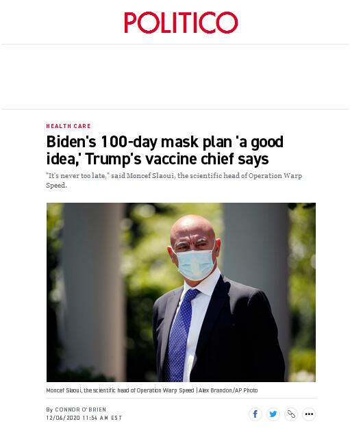 (“政客”新聞網:特朗普(政府)的疫苗負責人説,拜登的100天戴口罩計劃是個“好主意”)