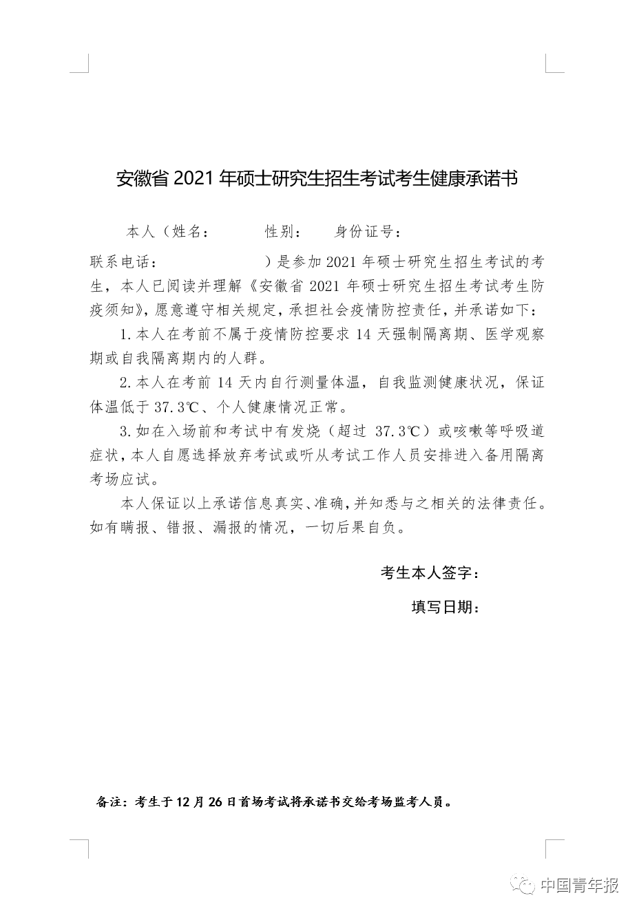 安徽省的《須知》指出,考生應在首場考試時攜帶《安徽省2021年碩士研究生招生考試考生健康承諾書 》進入考點,並在進入考場時交給監考員。