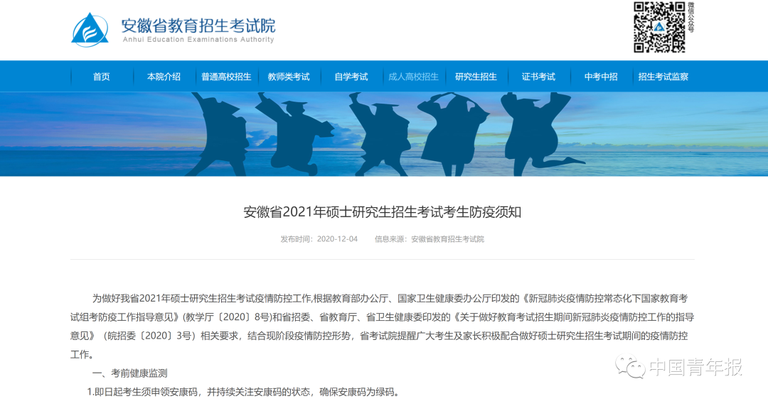 安徽省教育招生考試院發佈《安徽省2021年碩士研究生招生考試考生防疫須知》,明確了疫情防控的相關要求。
