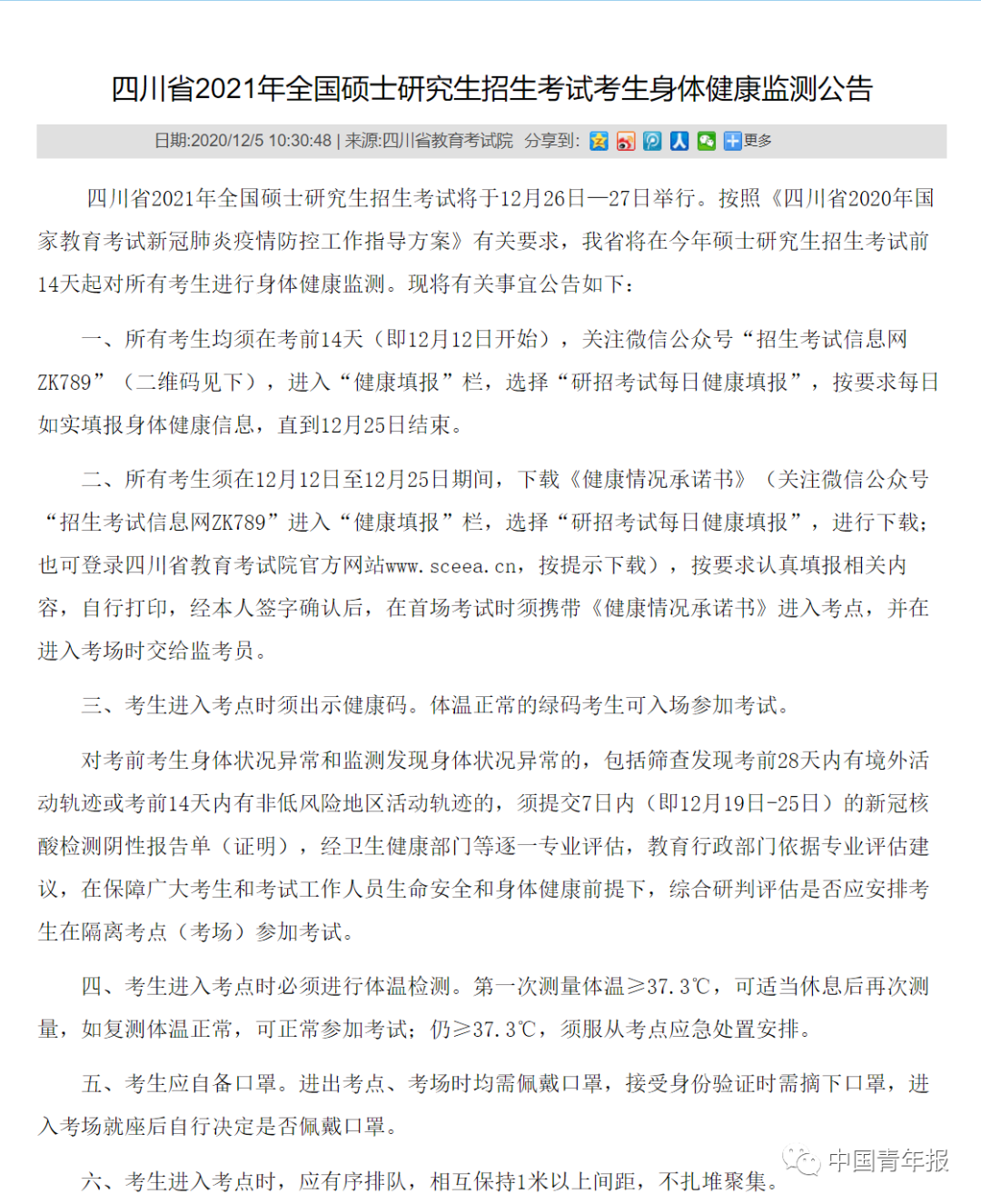 四川省 要求,體温正常的綠碼考生可入場考試。