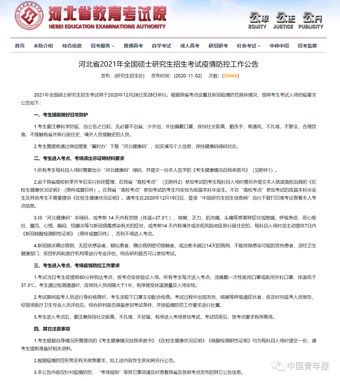 河北省 要求,持“河北健康碼”非綠碼,或考前 14 天內有發燒(體温≥37.3℃)、咳嗽、乏力、肌肉痛、頭痛等感冒樣症狀或憋喘、呼吸急促、噁心嘔吐、腹瀉、心慌、胸悶、結膜炎等與新冠病毒感染有關的症狀,或考前14 天內有境外或非低風險地區旅行居住史的,每科目入場時須主動提供7日內《新冠核酸檢測陰性證明》(原件或複印件),否則不得進入考點。
