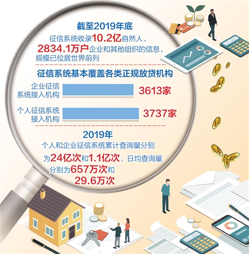 中國人民銀行徵信中心負責建設、運行和維護的全國集中統一的企業和個人徵信系統(即金融信用信息基礎數據庫),是國家金融基礎設施的重要組成部分。數據顯示,截至2019年底,徵信系統收錄10.2億自然人、2834.1萬户企業和其他組織的信息,規模已位居世界前列;個人和企業徵信系統分別接入機構3737家和3613家,基本覆蓋各類正規放貸機構;2019年,個人和企業徵信系統累計查詢量分別為24億次和1.1億次,日均查詢量分別為657萬次和29.6萬次。