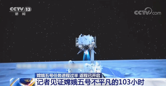 總枱央視記者 崔霞: 大家現在看到的就是上升器從月面起飛的畫面,非常的漂亮。