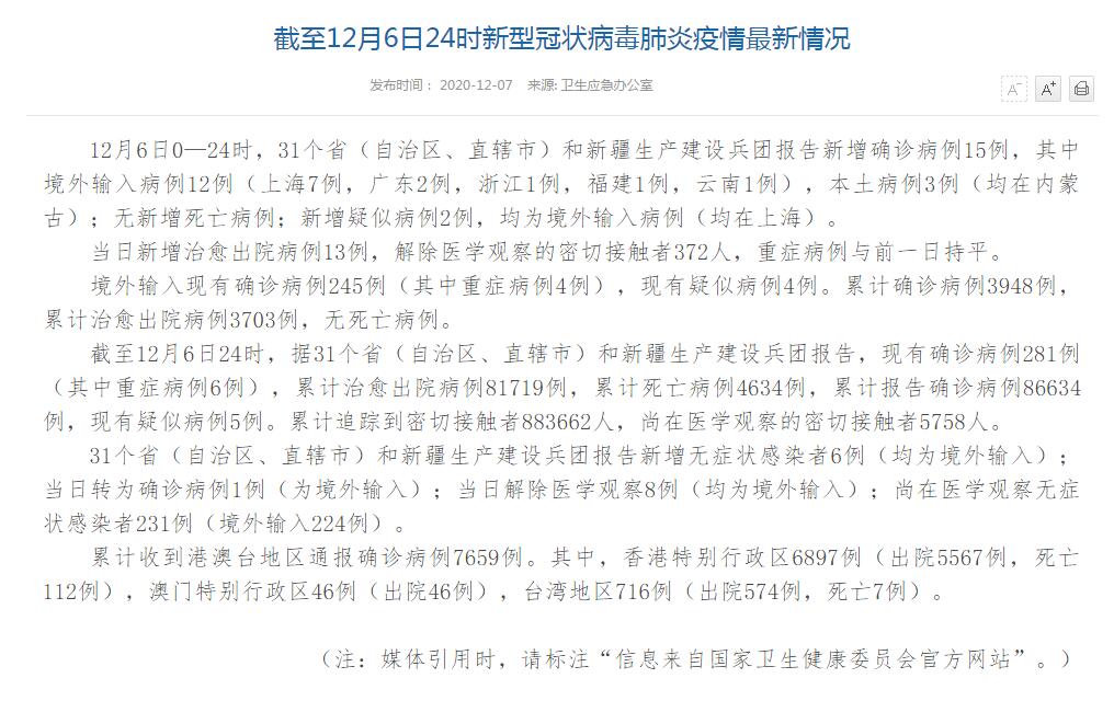 12月6日0—24時,31個省(自治區、直轄市)和新疆生產建設兵團報告新增確診病例15例,其中境外輸入病例12例(上海7例,廣東2例,浙江1例,福建1例,雲南1例),本土病例3例(均在內蒙古);無新增死亡病例;新增疑似病例2例,均為境外輸入病例(均在上海)。