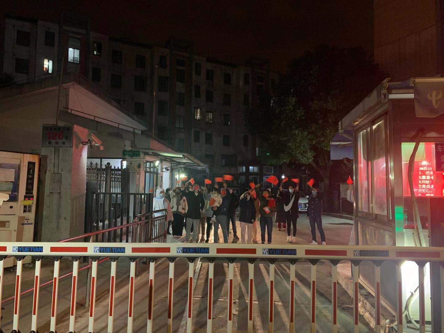 就在解封前20分鐘,小區居民已自發站在小區門口,揮舞着小國旗,迎接解封的到來。“出來啦!”一位幼兒被抱在父親手中,聲音清脆地喊道,引發了周邊陣陣歡笑。