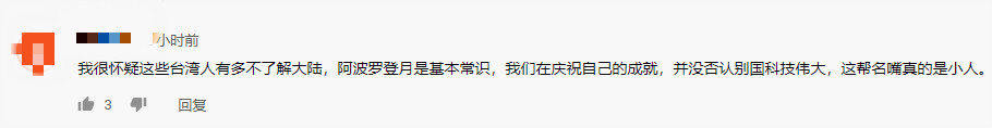 “我很懷疑這些台灣人有多不瞭解大陸,阿波羅登月是基本常識,我們在慶祝自己的成就,並沒否認別國科技偉大,這幫名嘴真的是小人。”