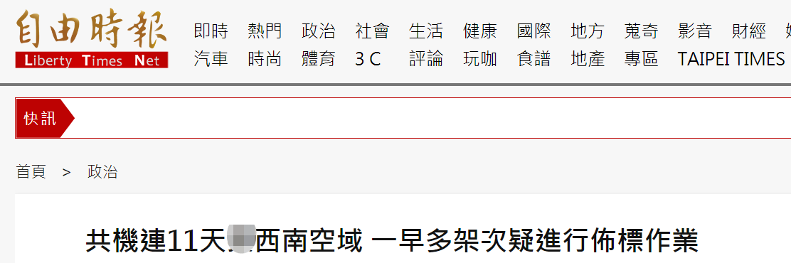 報道援引“台灣西南空域”粉絲專頁統計稱,解放軍軍機本月累計進入台西南空域7天,也是連續第11天進入台西南空域。