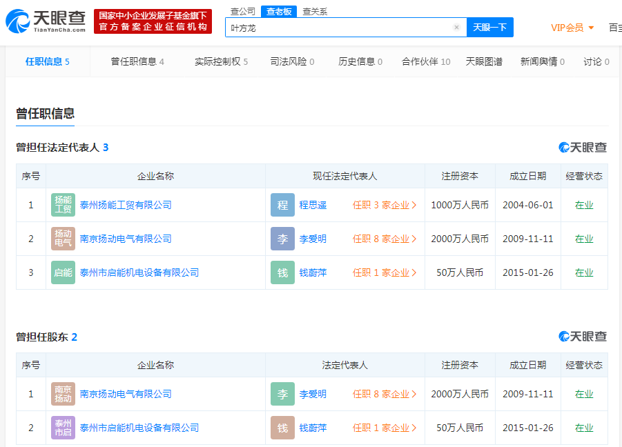 除此之外,上述信息還牽出神秘人葉方龍。工商資料顯示,葉方龍還曾擔任揚電科技關聯企業泰州揚能工貿有限公司、南京揚動電氣有限公司的法定代表人。葉方龍不僅曾是揚電科技關聯企業法定代表人,報告期內,還長期擔任揚電科技大供應商泰州市啓能機電設備有限公司的法定代表人。