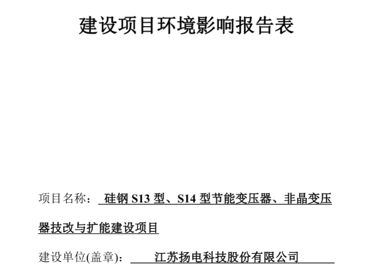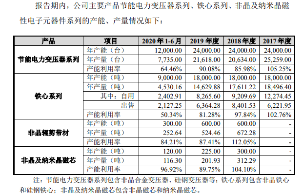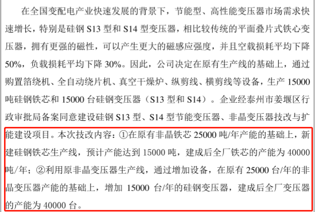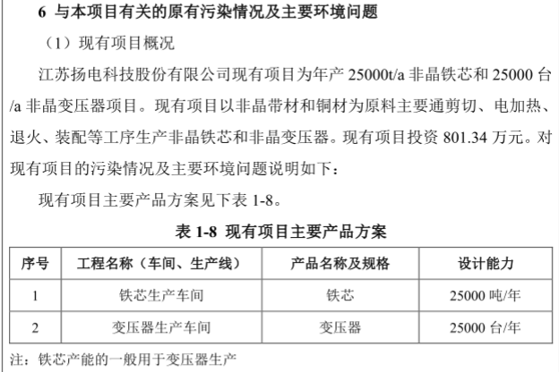 招股説明書披露,報告期內,揚電科技主要產品節能電力變壓器系列產能為24000台,鐵心繫列產能18000噸。但此次募投項目的《建設項目環境影響報告表》卻稱,揚電科技現有項目產能是年產25000t/a非晶鐵芯和25000台/a非晶變壓器項目。