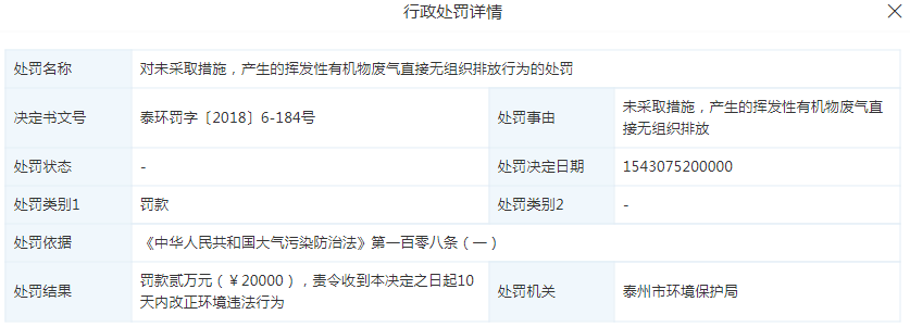 天眼查顯示,2018年11月,泰州市啓能機電設備有限公司因未採取措施,產生的揮發性有機物廢氣直接無組織排放,被泰州市環境保護局罰款2萬元。而工商資料顯示,該公司經營地是泰州市姜堰區羅塘街道人民北路99號,正是租賃揚能工貿場地。