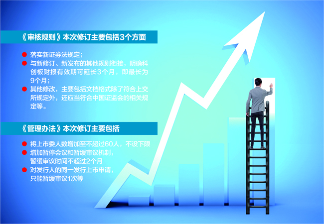 據《每日經濟新聞》記者觀察,《審核規則》本次修訂主要包括3個方面的內容,一是落實新證券法規定;二是與新修訂、新發布的其他規則銜接,明確科創板財報有效期可延長3個月,即最長為9個月;三是其他修改,主要包括文檔格式除了符合上交所規定外,還應當符合中國證監會的相關規定等。《管理辦法》本次修訂主要包括6個方面的內容,其中包括將上市委人數增加至不超過60人,不設下限;增加暫停會議和暫緩審議機制,暫緩審議時間不超過2個月,對發行人的同一發行上市申請,只能暫緩審議1次等具體規定。