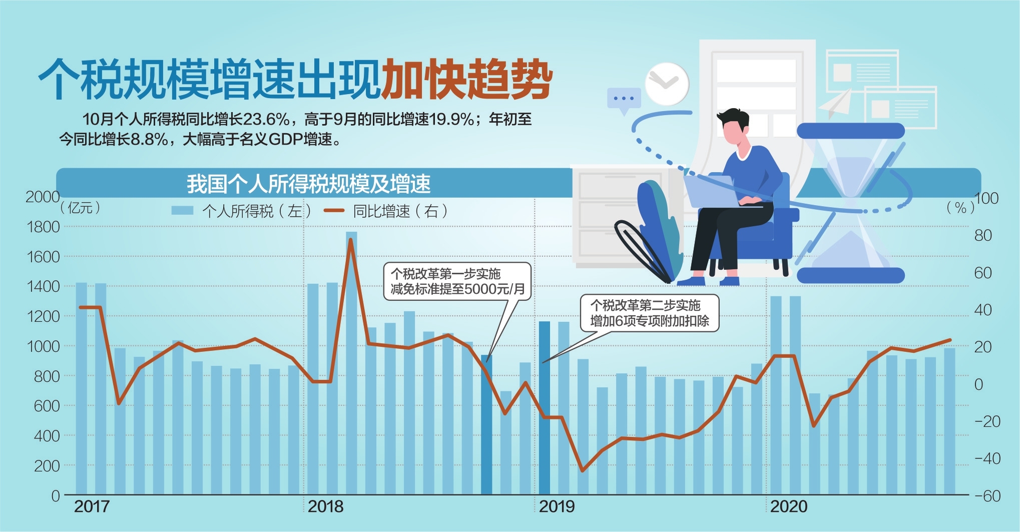 12月4日,國家税務總局發佈公告,自2021年1月1日起,對上一完整納税年度內每月均在同一單位預扣預繳工資、薪金所得個人所得税且全年工資、薪金收入不超過6萬元的居民個人,扣繳義務人在預扣預繳本年度工資、薪金所得個人所得税時,累計減除費用自1月份起直接按照全年6萬元計算扣除。即,在納税人累計收入不超過6萬元的月份,暫不預扣預繳個人所得税;在其累計收入超過6萬元的當月及年內後續月份,再預扣預繳個人所得税。