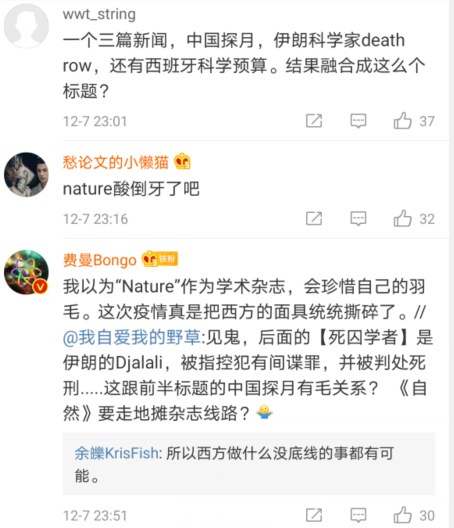 然而,《自然》科學雜誌的網站在標題中將中國登月項目與伊朗死刑案放在一起的奇怪做法,卻引起了不少中國網民的不滿。