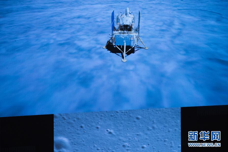 2020年12月1日23時11分,嫦娥五號探測器成功着陸在月球正面西經51.8度、北緯43.1度附近的預選着陸區,並傳回着陸影像圖。這是在北京航天飛行控制中心拍攝的嫦娥五號探測器落月瞬間。新華社記者 金立旺 攝