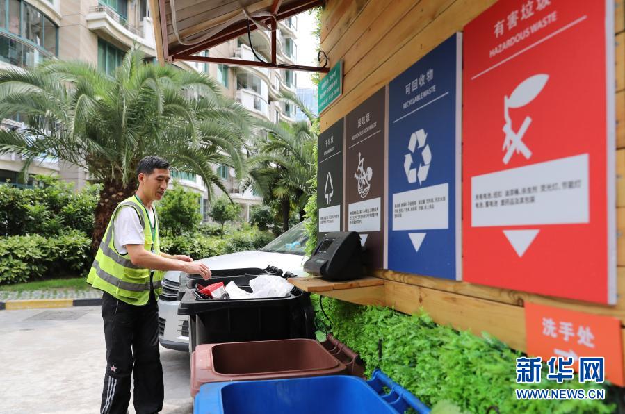 在上海市虹口區嘉興路街道一處小區,保潔工對居民分類投放的生活垃圾進行分揀(2019年6月24日攝)。新華社記者 方喆 攝