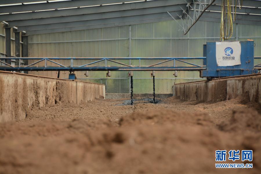 在福建省福清市永誠華多種豬公司豬場內,半自動化機械將收集的養殖糞污噴灑至墊料上。這是福建首創的“異位發酵牀”技術,發酵後的糞污可以作為有機肥源,並可以讓養殖場實現污染“零排放”(2019年8月12日攝)。新華社記者 林超 攝