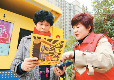近日,江蘇省連雲港市海州區多個生活小區的物業公司將“愛分類愛回收”智能回收機引進小區,居民可通過手機掃描二維碼,按照物品類別進行投遞並獲取相應獎勵。圖為日前,在海州區鬱洲街道學院社區,工作人員給居民講解智能回收機的具體使用方法。