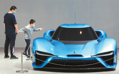 10月3日,江蘇省南京市,2020(第十九屆)南京國際汽車展覽會,人們在蔚來汽車展位前觀看展出的一款蔚來純電動跑車。