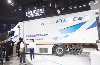 11月6日,第三屆進博會汽車展區,現代汽車展示的全球首款量產氫燃料電池重卡受到參觀者關注。