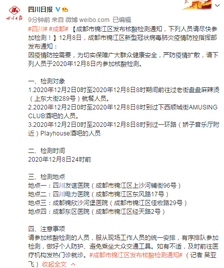 12月8日,成都市錦江區新型冠狀病毒肺炎疫情防控指揮部發布通知: