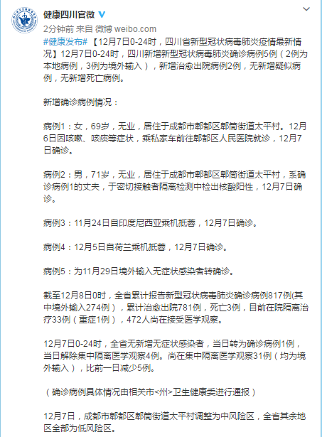 12月7日0-24時,四川新增新型冠狀病毒肺炎確診病例5例(2例為本地病例,3例為境外輸入),新增治癒出院病例2例,無新增疑似病例,無新增死亡病例。