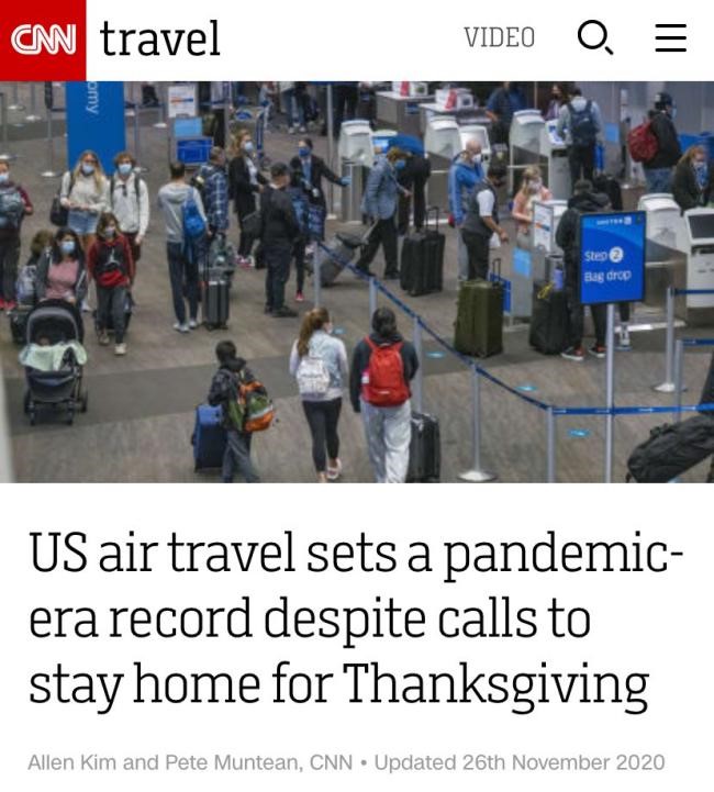 △CNN報道,許多美國人無視防疫指南,令感恩節期間的航空旅行數據打破了疫情期間的紀錄