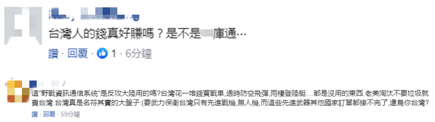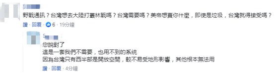 也有網友稱,“野戰通訊?台灣想去大陸打叢林戰嗎?台灣需要嗎?美帝想賣你什麼,即使是垃圾,台灣就得接受嗎?”“您説對了,這是一套我們不需要,也用不到的系統,因為台灣只有西半部是開放空間,較不易受地形影響,其他根本無法用。”