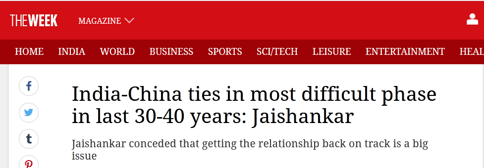 印度外長:中印關係可能處於過去三十至四十年來“最困難的階段”