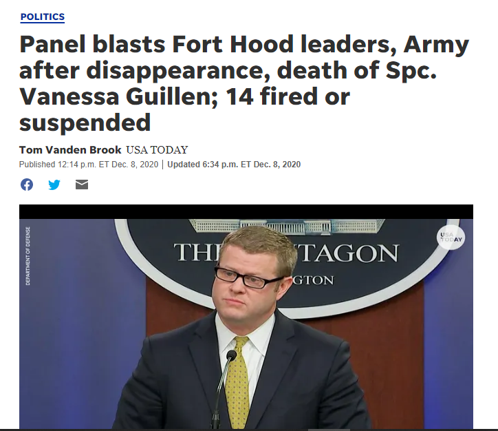 今年4月,一名在美軍胡德堡基地服役的女兵在遭遇上級性騷擾後,被施暴者用錘子打死並肢解拋屍,此外,該基地在今年內發生了26名士兵意外身亡事件。當地時間12月8日,美國陸軍宣佈該基地14名軍官被解僱或停職。