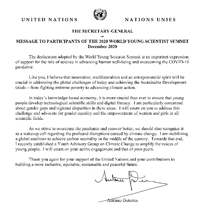 聯合國秘書長古特雷斯致信世界青年科學家峯會參會者:期待一起應對挑戰