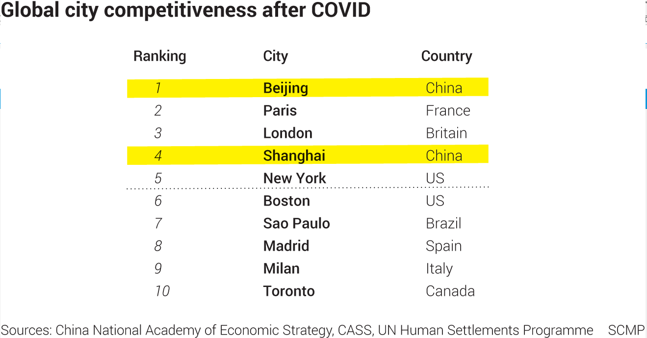 《南華早報》提到,根據中國社會科學院(CASS)和聯合國人類住區規劃署聯合發佈的《全球城市競爭力報告(2020-2021年)》,北京因合著科研論文數量最多而位居榜首。報告提到,巴黎位居第二,緊隨其後的是倫敦、上海、紐約、波士頓、聖保羅、馬德里、米蘭和多倫多。