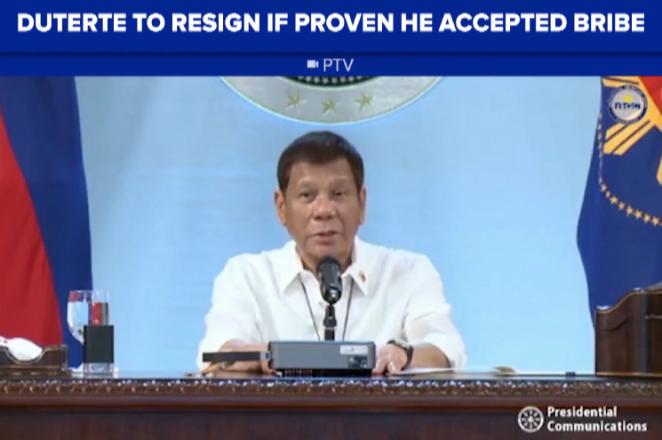 杜特爾特在講話中表示,現在外界有很多猜測,認為他和內閣成員受賄。“只要帶來一個人説他給了我一比索,我明天就辭職。”杜爾特爾回應稱。“只要一個人,一份宣誓書。”他補充説,只要有人説他受賄,就帶到公眾面前,如果消息屬實,他將立馬辭去菲律賓總統職位。