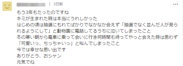 也有日本網友在社交媒體上回憶起去看“香香”的快樂時光:在冬天寒冷的早晨坐電車去見你,等了好幾個小時之後終於看到了你的樣子,不由自主地叫到:“好可愛,好小啊……”現在依然是幸福的回憶!謝謝你,一定要保重。