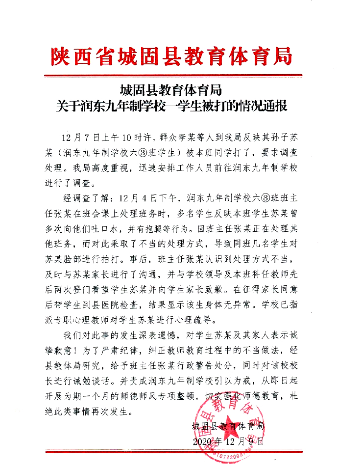 近日,陝西城固縣有家長實名舉報其子蘇某行就讀城固縣東郊潤東學校六年級,因與同學發生摩擦向同學吐口水,被班主任指使班上10名同學向其扇耳光,每人10下,共100下。導致該學生臉部腫脹,耳根疼,無法上課,給孩子造成巨大心理陰影。12月9日,城固縣教育體育局對外通報了此事的調查結果。全文如下: